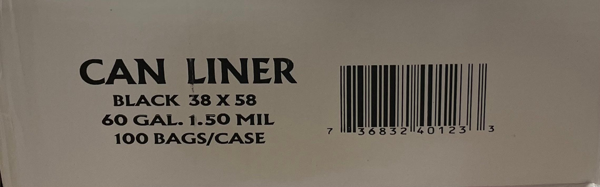 Black can liner 38 x58 60 Gal 1.50 MIL 100 bags/Case